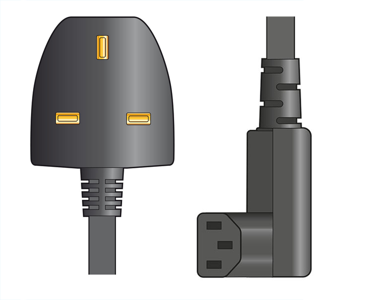 UK 3 pin plug to right angle IEC C13 female plug, 3 core mains power lead, suitable for connecting power to general electronic equipment of up to 2300W.