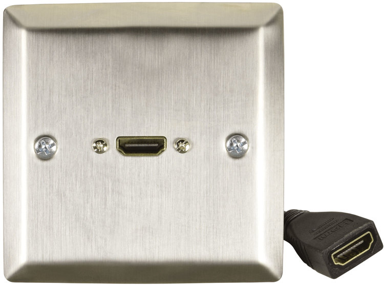 A standard brushed steel UK type wallplate with a gold plated HDMI socket and female tail to the rear. Ideal for connecting HD display devices in a different location without the need for trailing wires. Suitable for domestic, commercial or educational applications.