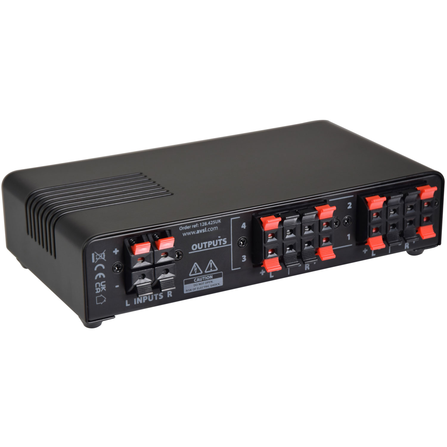 - Enables four pairs of speakers to be connected to a single stereo amplifier