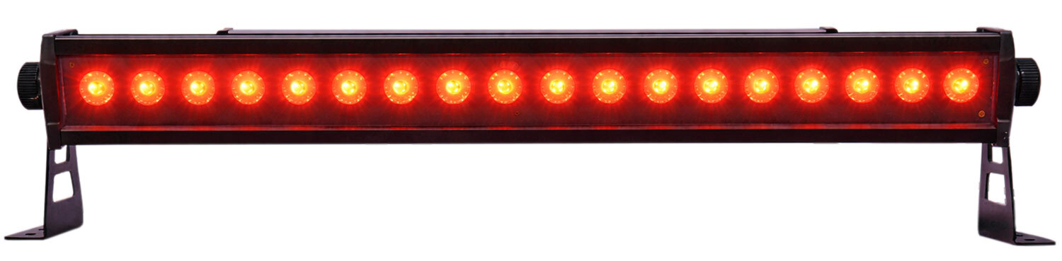 The Citronic Aqua-Bar combines premium quality components with a heavy-duty waterproof housing to offer the ultimate outdoor wall wash solution. 18 high output RGBWA/UV LEDs can be controlled automatically from preset internal colour sequences, alternatively the bar can be operated remotely by DMX in either 6, 8, 9 or 12 channel modes if more precise control is required. Supplied with extendable waterproof connections and tilt-adjustable brackets for mounting to walls or ceilings.