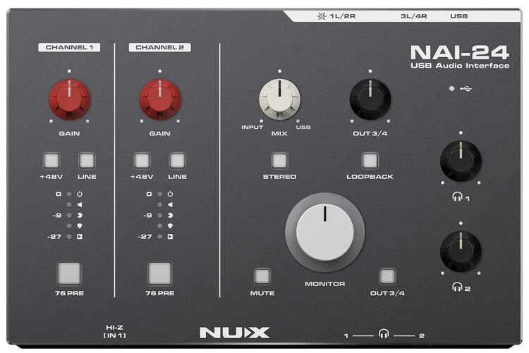 NAI-24 is a USB audio interface built to deliver premium sound quality to home and project studios. Incorporating studio grade audio transformers for noise-free signal isolation, discrete class-A preamplifiers for pure sound integrity, and professional AD/DA chips to accurately digitize the result with minimal latency. NAI-24 has 2 mic/line inputs, each equipped with a pure FET 76-style compressor with selectable preset modes. 48V phantom power is switchable to either input and a front-mounted HI-Z input can handle a guitar or other instrument directly though input 1. Multiple routing options to 2 independent sets of speakers or headphones can be used to monitor the signal directly or post processing. To complete the package, each NAI-24 ships with an access code to download your own licensed copy of CUBASE 13 LE professional recording software. NAI-24 turns your PC or Mac computer into a fully functioning recording setup with the same qualilty normally only found in large commercial studios.