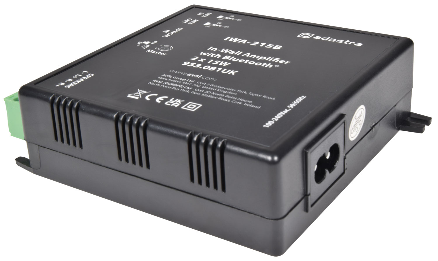 Stereo amplifier units for background music and public address in a minimalist housing for installation into cavity walls and ceilings. Class-D amplifier design operates cleanly and efficiently with minimal heat dissipation, combined with an internal digital switch-mode power section, which enables easy connection directly from the local mains supply. Bluetooth compatibility enables wireless streaming of audio files from a smart phone or other enabled device in addition to 3.5mm Aux input and an optical digital audio input, ideal for integrating into A-V systems. For discreet and trouble-free installation without any need for table-top or cabinet installation, these amplifiers can be combined with many different speaker types to provide the ideal sound system for any small to medium space or deployed in numbers to create a wide area sound installation.