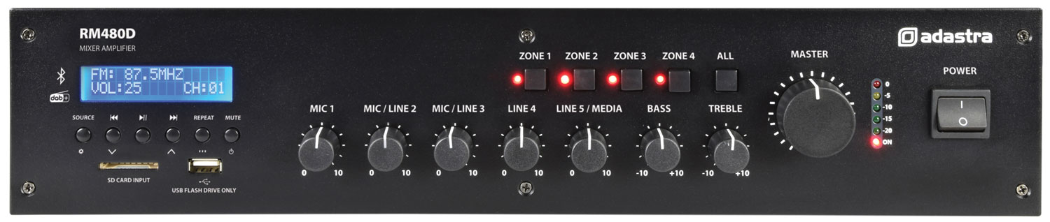 5-channel 19" rack-mountable mixer-amplifier, tailored to commercial sound installations to power 100V line speakers or standard speakers down to a 4 Ohm load. Input options include XLR (with switchable phantom power), mic/line jack, and RCA line. Features an inbuilt DAB+/FM radio tuner, front-mounted SD/USB ports, and Bluetooth® connectivity, all controlled via an integrated media player for hassle-free playback. A switchable ‘voiceover’ feature automatically lowers the background music volume when a signal is detected via mic input 1, and rear panel 24V contacts can mute all except mic input 1 when triggered. Outputs on screw terminal are via 4 switchable zones with a separate "always on" output for priority alert speakers.