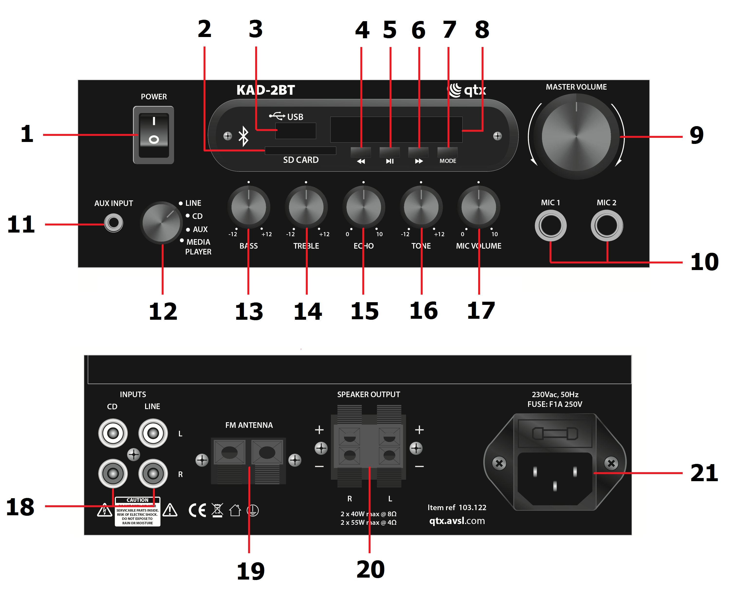 Thank you for choosing the QTX KAD-2BT stereo amplifier. This compact class D digital amplifier is capable of delivering a powerful 55W max output per channel. With 4 selectable inputs, 2 mic inputs and various controls, this is a great multipurpose amplifier for both domestic and commercial use.