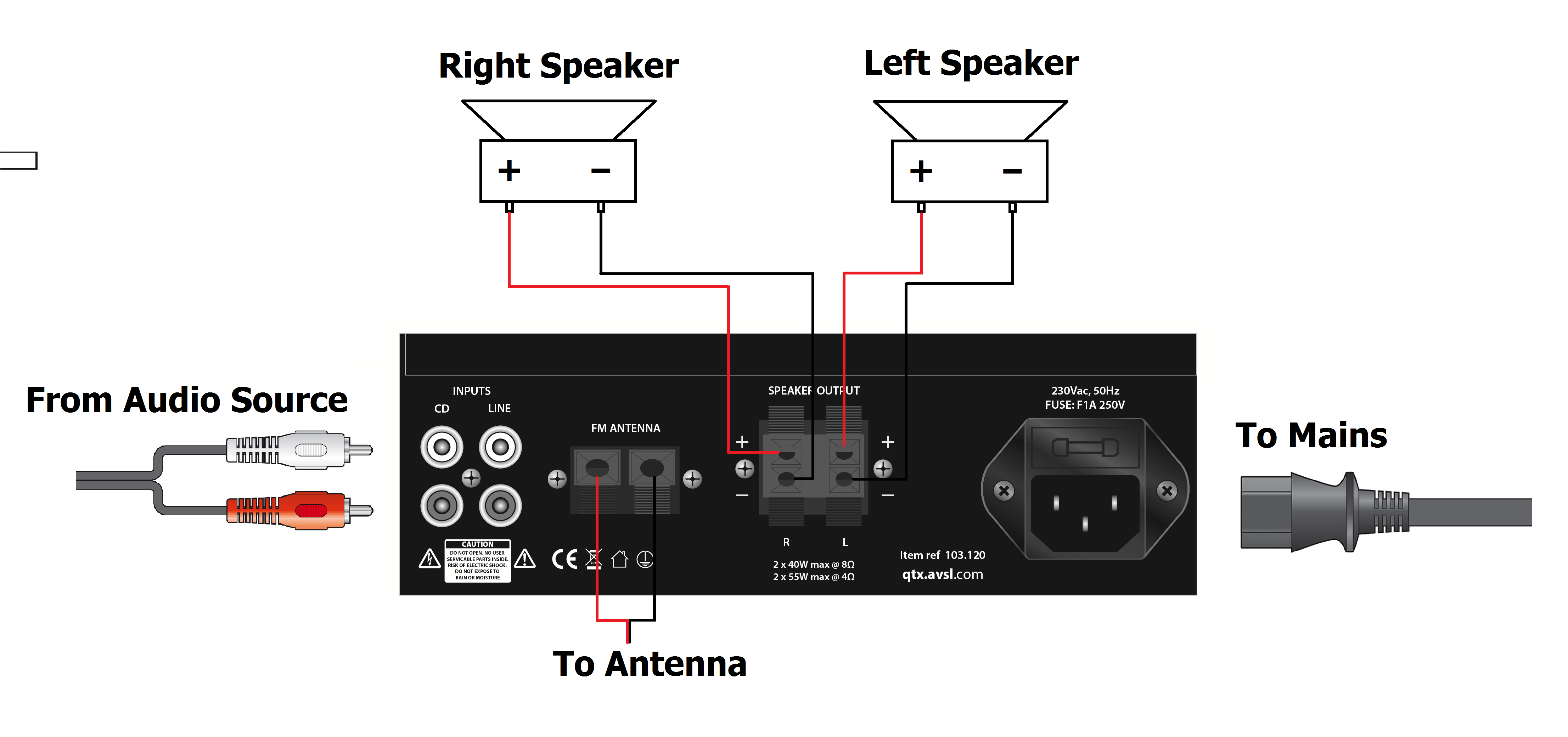 Wire speakers to the amplifier as shown above, ensure the positive and negative terminals are wired correctly. Audio input on the back is through 3 pairs of RCA connectors, ensure left and right signals are correct for stereo output. Finally insert the IEC plug and connect the unit to the mains. Before switching on, always ensure the master volume is set at the lowest point to avoid power surge damage to the unit or speakers. Adjust the volume accordingly to an appropriate listening level.