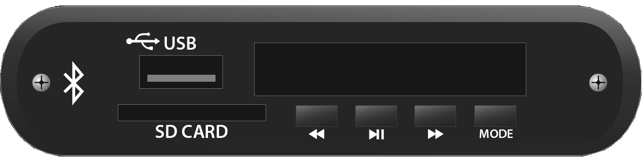 MP3 files can be played through an SD card or USB stick. Plug in the memory device and media will automatically start playing. Alternatively press Mode button until “USB” is displayed on the screen. To make a selection, press for previous or for next song respectively (press and hold for reverse or press and hold for fast-forward). For play and pause press the button.