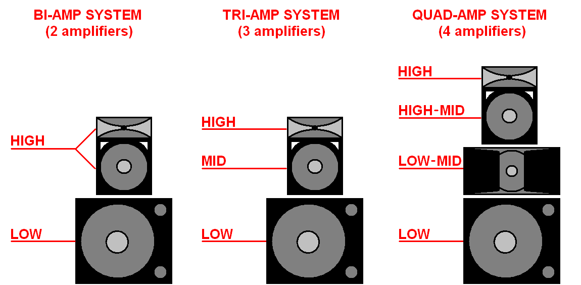 In a quad-amped system, the LOW (or LF SUM) output is connected to the input of the power amplifier which will drive the sub cabinets, the LOW-MID output is connected to the power amplifier which will power the dedicated mid-range cabinets, the HIGH-MID outputs are connected to the power amplifier which will power the main drivers of the mid-top cabinets and the HIGH outputs are connected to the inputs of the power amplifier which will drive the high frequency drivers in the mid-top cabinets