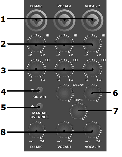 - DELAY Delay effect level for Vocal mics 1 + 2