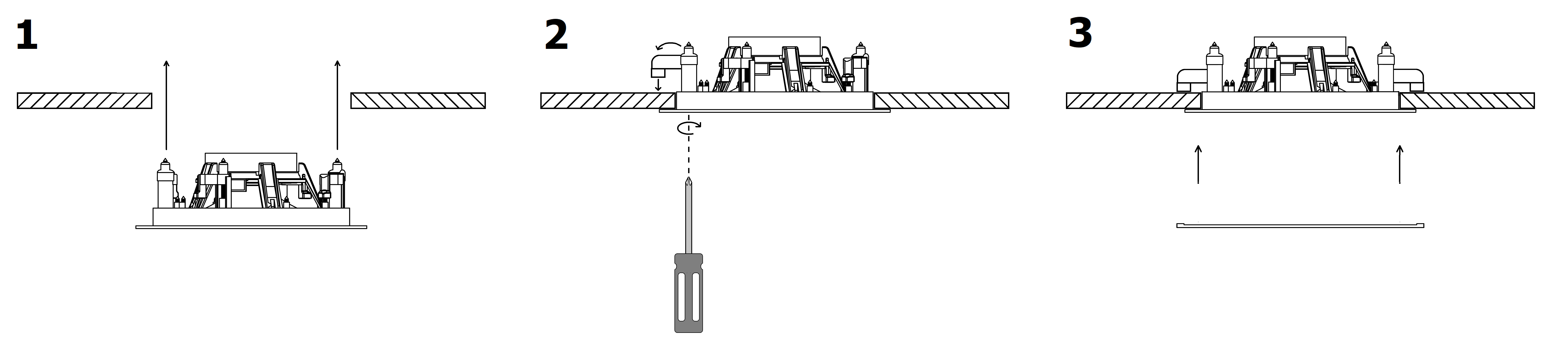 - Use a cross head screwdriver to turn the 4 dog-ear clamps outward in turn, then continue turning the screwdriver to draw the dog-ear clamps toward the ceiling or wall supporting surface, taking care not to over-tighten the clamps.