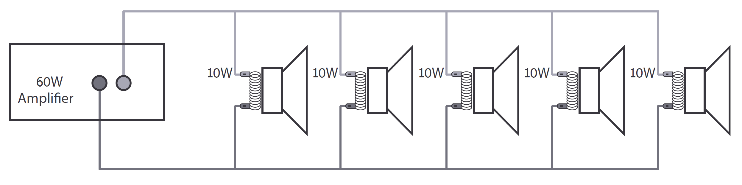 A 100V line speaker system can comprise of many speakers connected together. The determining factor for how many speakers can be used on a single amplifier is the power rating. For most purposes, it is advised to connect as many speakers as needed with a combined wattage of no more than 90% of the amplifier’s output power rating.