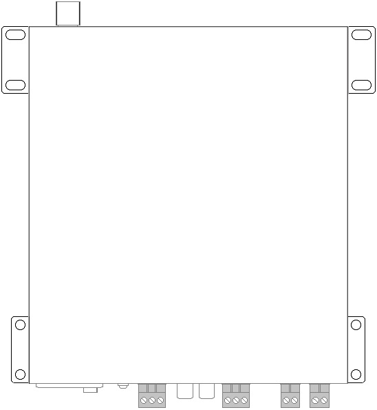 The rack mounting accessories can also be attached so that the amplifier can be mounted against a wall or under a counter or work surface. To do this, mount the rack ears with the tabs aligned with the top of the housing to provide mounting holes to screw the amplifier to the underside of a work surface or against a wall with the controls visible vertically.