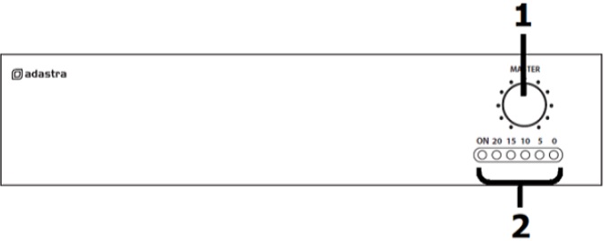 Play an input signal (line or 100V) into the amplifier to check the system. Turn up the MASTER volume control (1) gradually until the output is heard through the speakers. The MASTER acts as the overall volume control.