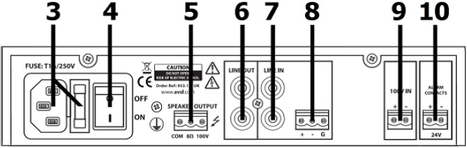 A pair of screw terminals is provided on the right side of the rear panel for connection to an alarm system if required (10). This connection will mute the LINE IN inputs but will not mute 100V IN (for alerts) when 24V is present across the terminals.