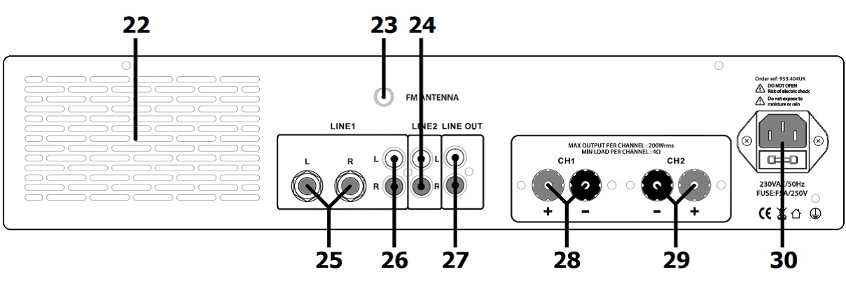 Connect the IEC power inlet (30) to the 230Vac mains supply, using the IEC lead provided.