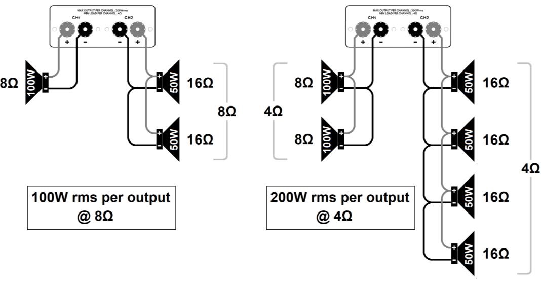 - If the speakers are 16Ω, you can connect up to 4 speakers in parallel to each channel.