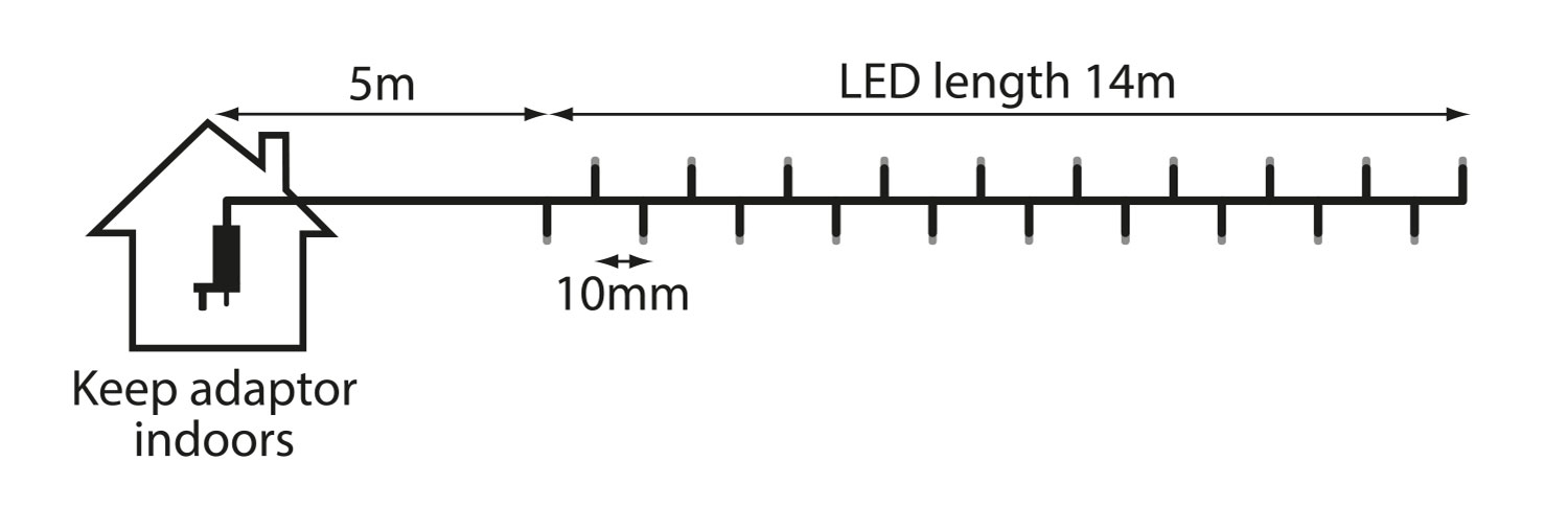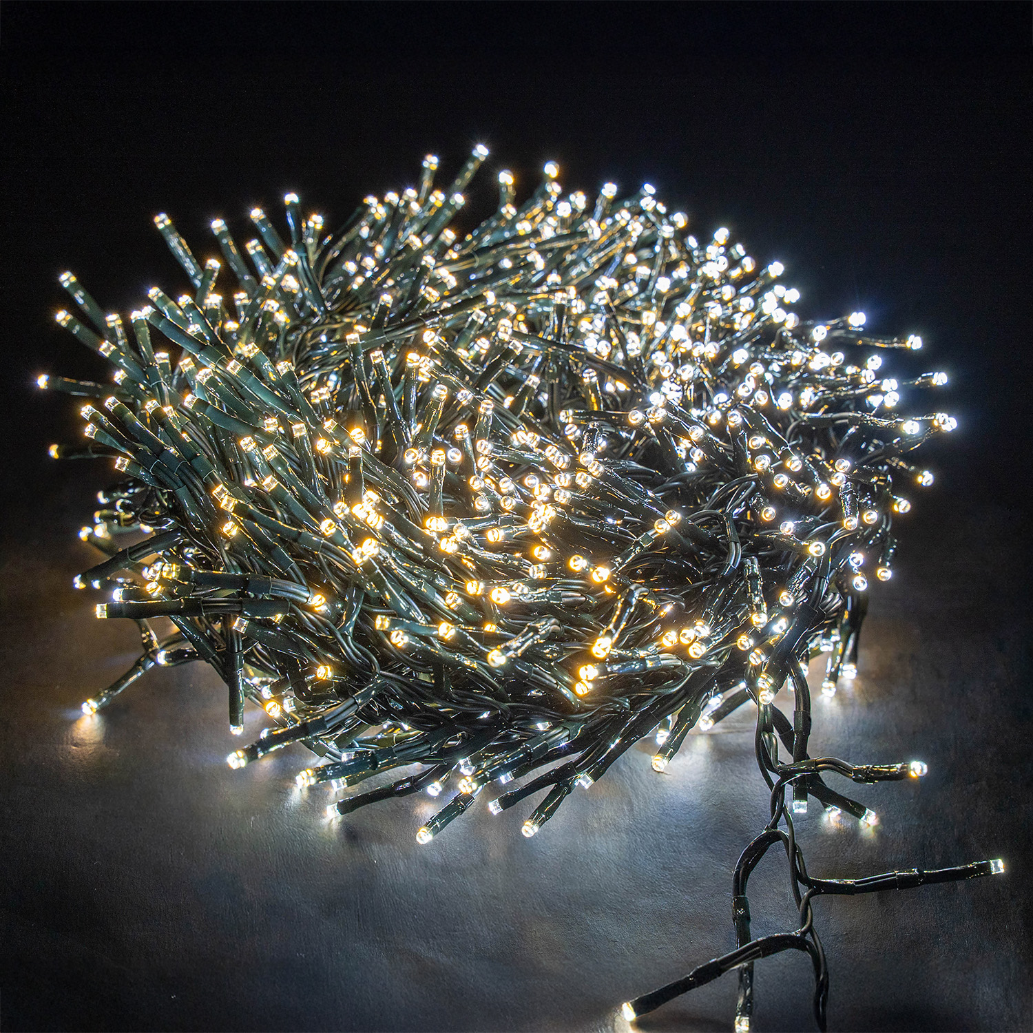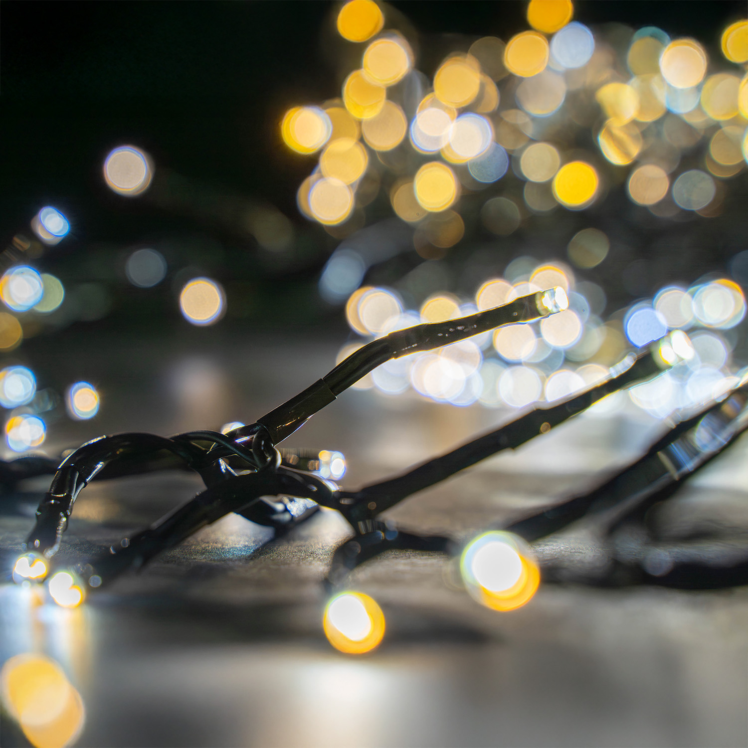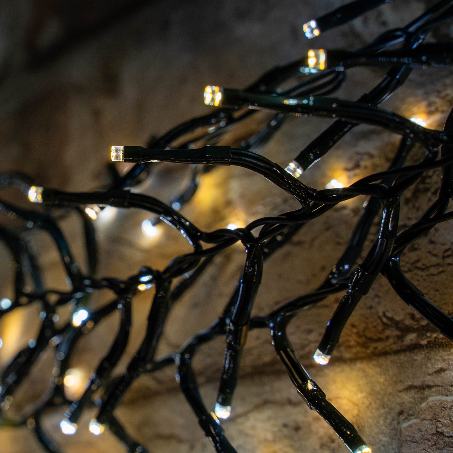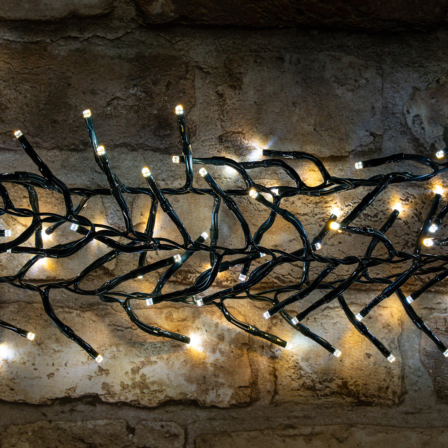 Versatile LED cluster string lights for the festive season, special events and atmospheric evenings all year round. Using the 8-programme button on the power adapter, you can switch through your desired lighting effect: Combo, Waves, Sequential, Slow Glow, Chase Flash, Slow Fade, Twinkle Flash and Steady ON. The lights also feature an energy-saving 8 hours on, 16 hours off timer function. The lights are 14m long with a dark green PVC cable and have a 5m power cable. These lights are IP44 rated and are suitable for indoor or sheltered outdoor use.