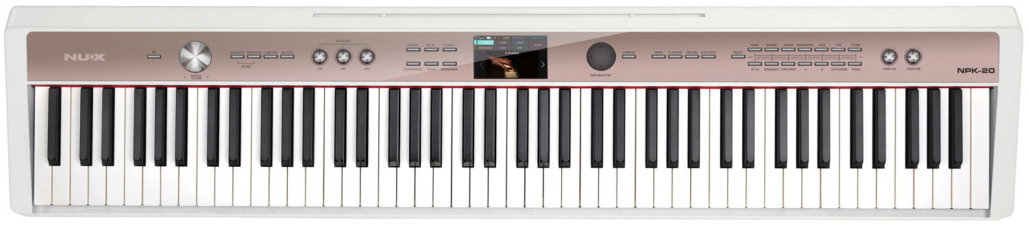 NPK-20 builds on the popular NPK-10 digital grand piano with a full 88-note keyboard in the same compact and convenient format. The triple-sensor, graded hammer-action keys have been further optimised to better respond to downforce, rebound and legato passages. Sound is delivered through base-mounted stereo speakers or from 2 headphone outputs under the keyboard's front edge. A huge palette of 271 internal sounds is divided into 7 groups, including a real, multi-sampled, high-end grand piano, with options for variable keyboard split or dual layering with octave-shift and balance control. Internal effects include 4 reverb models, 4 compression profiles, chorus, delay and 9-band EQ, all with individual parameter settings. Editing is immediate and intuitive using the comprehensive onboard controls, in conjunction with a 4" full colour LCD display, and all sounds and effect settings can be stored for immediate recall in one of 7 user preset slots. NPK-20 also has a sophisticated auto-accompaniment feature with 100 selectable styles that follow your played chords to construct a full backing track. Alternatively, the Auto-Chord feature may be switched off to use the drum section on its own. USB connection to a computer sends and receives MIDI for recording and playback. MIDI and audio can also be wirelessly transmitted via Bluetooth®, which can also be used in conjunction with the free "Piano Mate" app for self tuition and exercises (other third party apps can also take advantage of this feature), with 5 onboard recording slots for practice and playback. In addition to the Aux input, the NPK-20 also features an independent microphone input with separate gain, volume and digital reverb controls. The microphone is mixed with the main keyboard sounds and accompaniment and delivered through the main Left and Right 6.3mm jack outputs for a fully self-contained arrangement. Taking digital pianos to the next level, the NPK-20 is the ultimate player's performance workstation.
