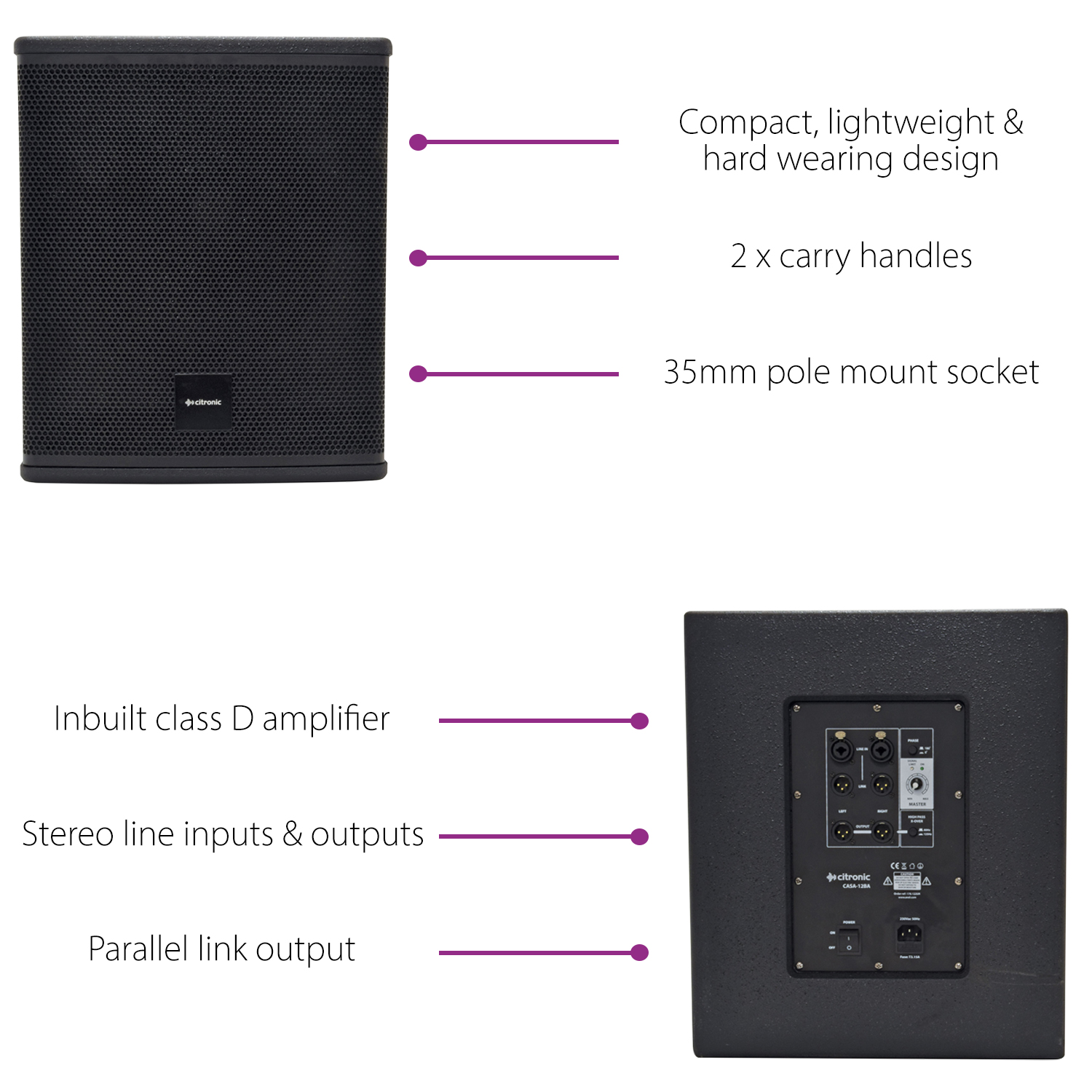 Lightweight yet powerful active subwoofer units with inbuilt class D amplifiers. Each cabinet is constructed from 15mm MDF with integral side handles for easy portability and 35mm socket to accommodate a mounting pole. The high flex sub driver is front-loaded with a protective steel grille to deliver powerful transients and add warmth to any sound system. The class D amplifier section has stereo line inputs and outputs to allow use either as a mono sub with stereo tops or a matching sub for each top speaker. Line inputs have a parallel Link output to pass the signal onto further active speakers and a pair of line outputs with switchable high pass filter to connect to active top cabinets. A phase switch is included to help avoid sound cancellation and time-align multiple speaker setups. Designed as a perfect match for the CASA series speakers and equally at home with other active full range cabinets.