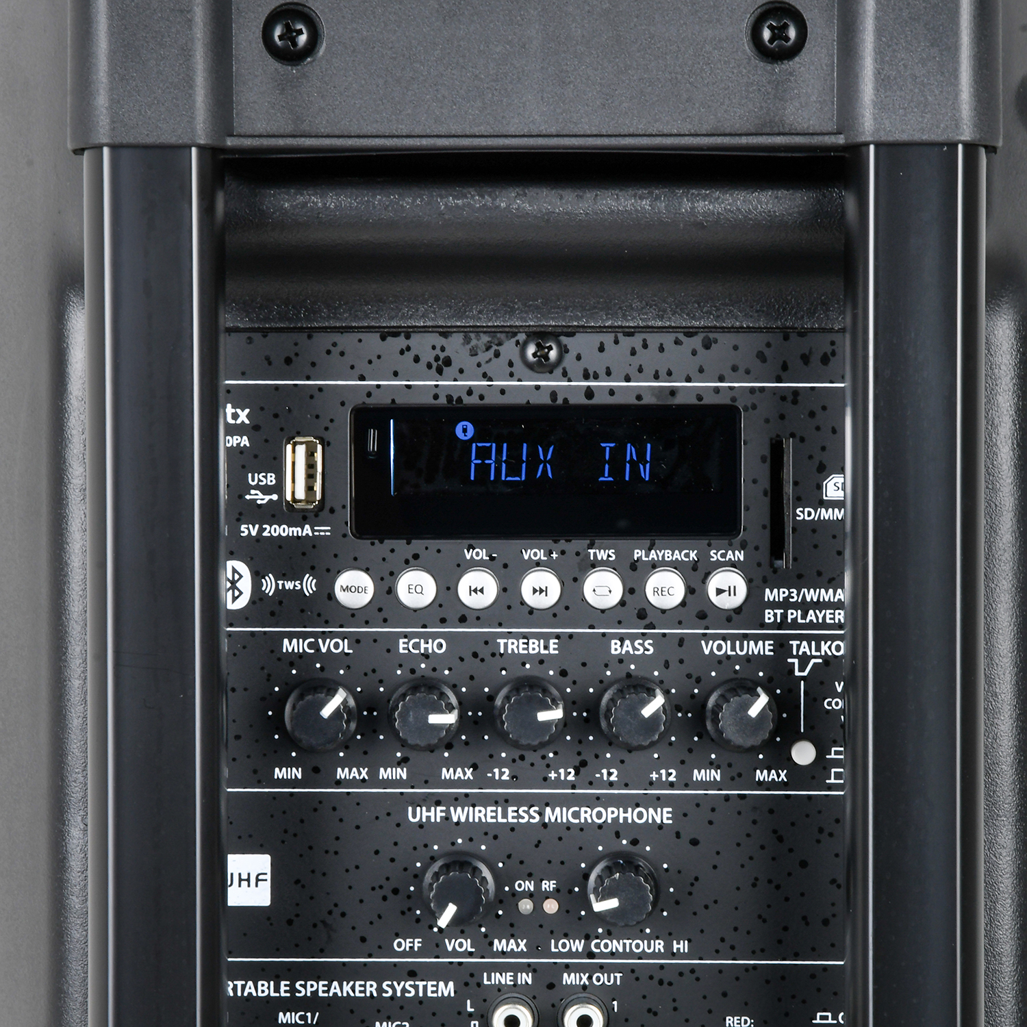 Compact portable PA units based on the QR speaker cabinet. Built-in amplifier operating from mains or internal rechargeable battery powering a main driver and compression driven horn unit. One or Two handheld UHF wireless microphones are included with the receiver built into the mixer/amp section at the rear along with a further two wired mic inputs, auxiliary line input and integral USB/SD/FM media player with record function. A Bluetooth receiver is also built into the media player to enable pairing with a smartphone or tablet for wireless audio playback with TWS pairing to link 2 QRPA units as a BT stereo pair. A retractable trolley handle and rear wheels provide easy portability.