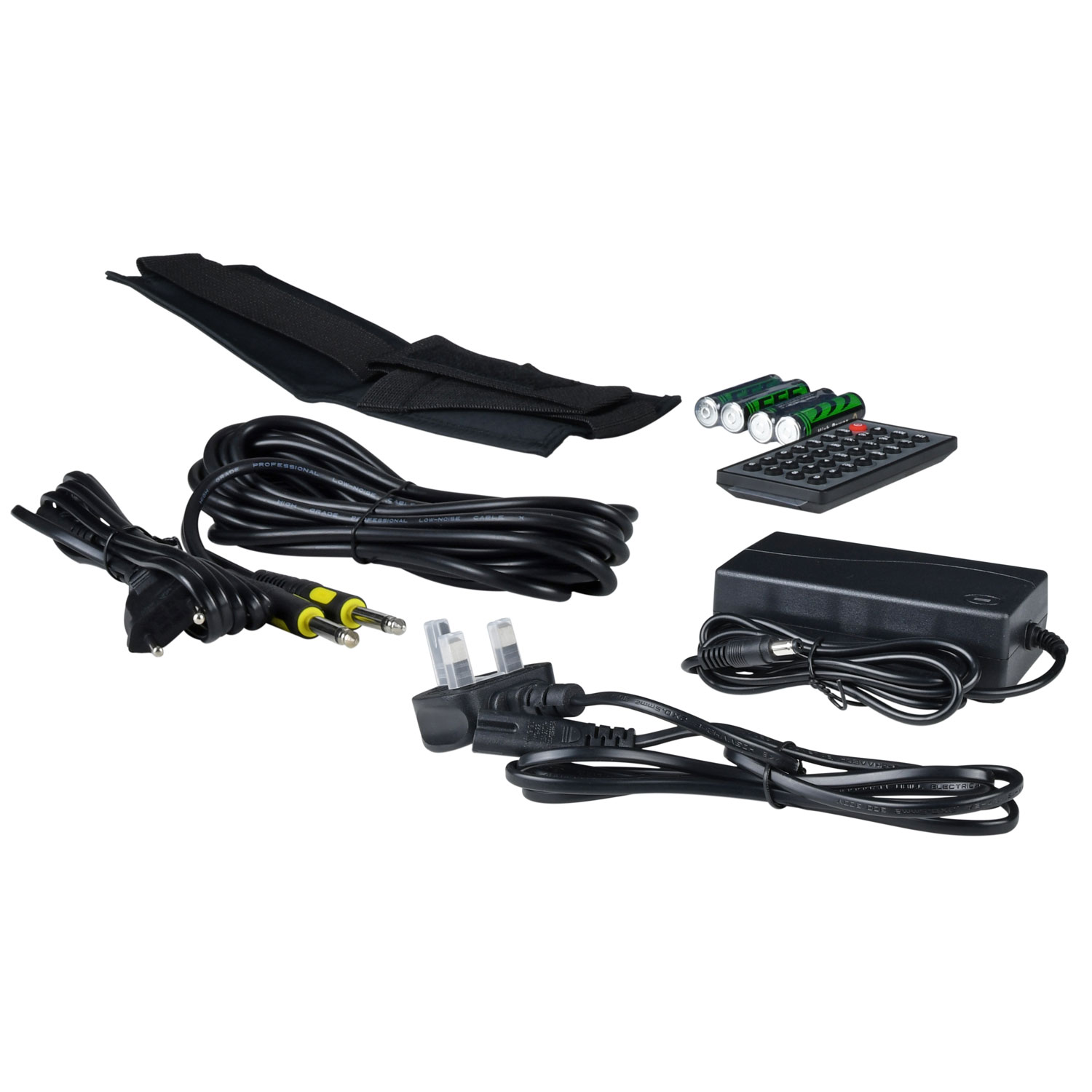 Portable PA set comprising a main active unit and passive satellite speaker. The main unit has a media player with options for playback from USB stick, SD card, Bluetooth or a slot fed disc player for CD and DVD. A pair of UHF handheld microphones are included in addition to 2 inputs for wired microphones with a built-in echo effect for vocalists and a VCV control enables mic priority over music. Operated from mains power or the internal rechargeable battery, the main unit also powers the passive satellite cabinet. Line input, output and composite video output offer easy connection to other equipment for expanded AV systems. A comprehensive multi-functional system for leisure, teaching and performances.