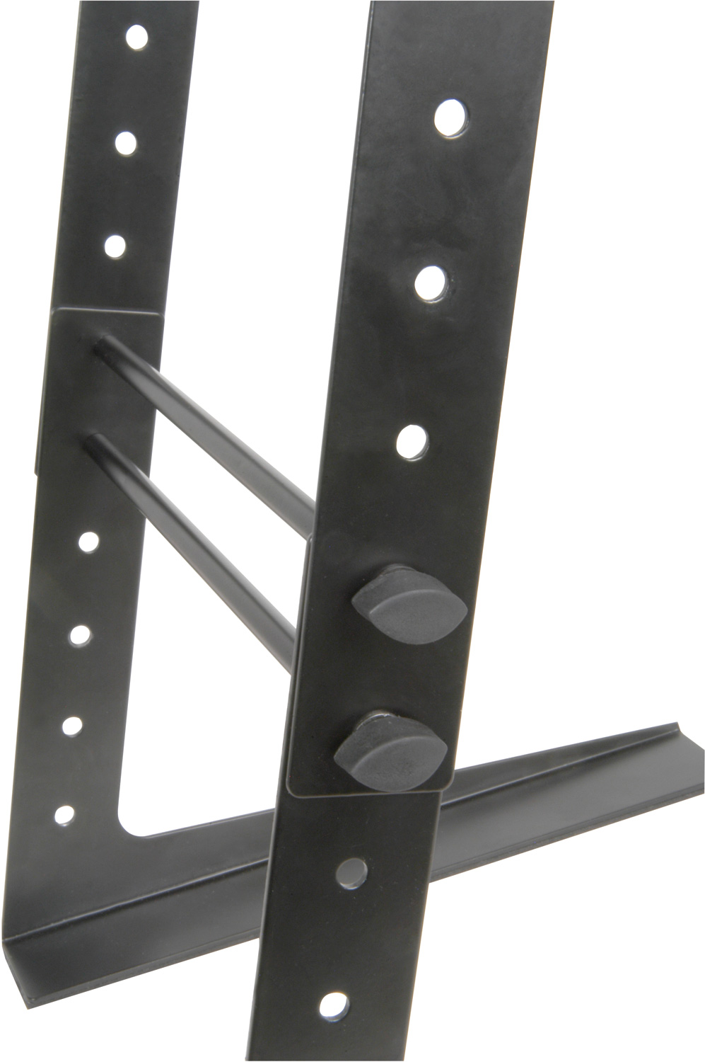 Desktop stand to support a laptop computer or DJ Decks. Allows positioning above other equipment at a fixed 15° angle for easy viewing. Can be assembled at any one of 5 possible height settings and has high density foam pads on the support arms and lower skids to avoid damage and slipping.