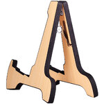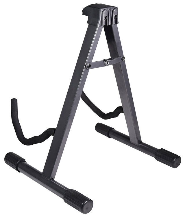 A foldable A-frame stand for acoustic, electric or bass guitars. Contoured forks hold either slim electric or deep acoustic guitar bodies in place, while supports avoid damage to the instrument.