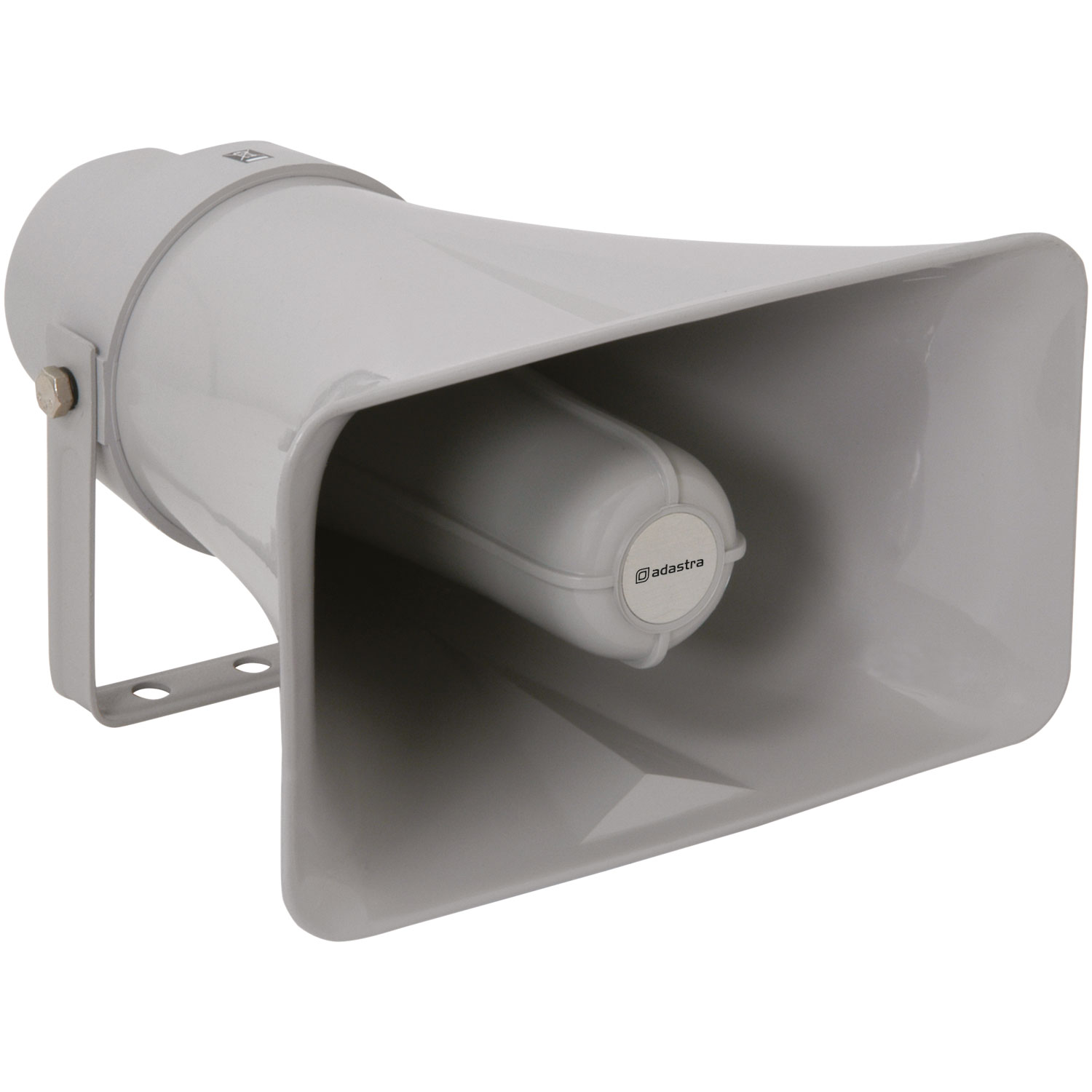 Active horn speaker with built-in amplifier for indoor or outdoor use. Constructed from high impact ABS material with IP66 protection for reliable operation in all environments. Fitted with an angle-adjustable bracket for convenient installation onto a wall or ceiling. Low voltage power and line level audio are connected via a single 4-core cable for simplified cable feed and connection. The horn should be powered from a filtered, noise-free 12Vdc power supply capable of 2.1A or 25W. Designed for voice alerts in CCTV and security systems or as a self-contained add-on for existing public address installations.