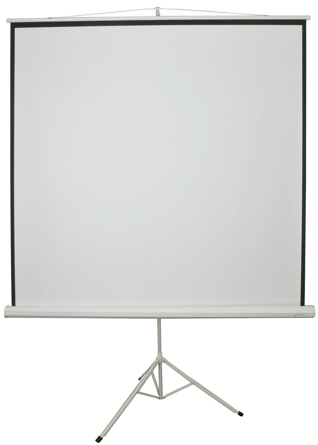 A projector screen housed in a white steel case and mounted on a tripod stand. This freestanding unit can be quickly assembled by pulling the screen up and hooking it onto the integral backrest. The screen simply retracts and the stand folds up for protection and storage when not in use. An ideal solution for educational environments, business presentations and home cinema use.