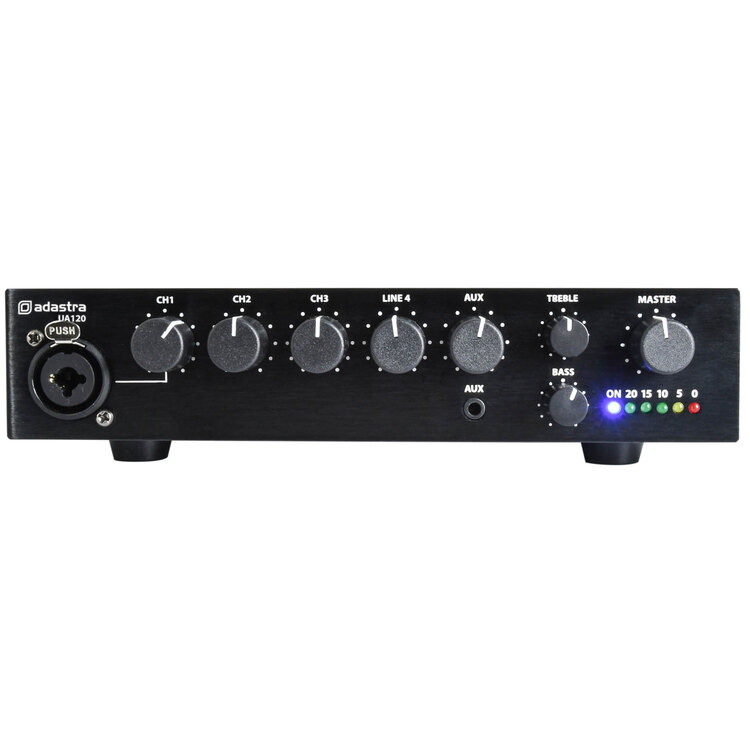 100V mixer-amplifiers with a 5-input mixer in a half width 1U housing. 3 switchable mic/line inputs, an RCA line input and a 3.5mm Aux input are governed by front panel volume controls and a Master… more