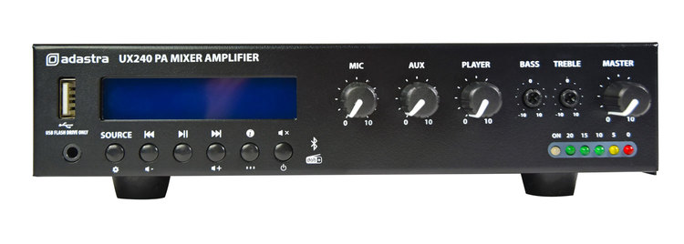Compact and high power 100V mixer-amplifiers with built-in media player. A combination jack/XLR microphone input has switchable phantom power and optional Vox priority function. Music playback is served by the internal media player, which has selectable source for USB mp3 playback, DAB+ or FM radio tuner, Bluetooth®, or a front mounted 3.5mm Aux input. An Aux line input has an independent volume control on the front panel. The amplifier produces a high power output to either 100V line or low impedance speaker loads down to 2 ohms, switchable via a DIP switch and connected on screw terminals, with level governed by a Master volume control and EQ handled by mini Bass and Treble rotary controls. The rear panel also has connections for a DAB+ or FM antenna or aerial and 24V mute contacts for triggering from a fire panel or emergency evacuation system. Each amplifier is supplied with brackets for mounting 2 units side by side in a 1U 19" rack or fitted to flat-mount the amplifier against a wall or under a counter-top. With a minimal control footprint and easy-to-manage controls, these mixer-amplifiers represent a versatile platform to build a public address installation for medium-sized areas or paired with further amplifiers as part of a wider sound system.