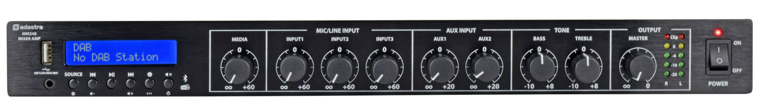 Compact 1U mixer-amp featuring a built-in media player with DAB+ and Bluetooth receiver. 3 mono inputs connect via XLR microphone or line input (switchable). Each of these inputs has switchable +20V phantom power for use with condenser microphones or D.I. boxes and channel 1 has a variable priority function. Two stereo auxiliary line inputs are provided on RCA connectors with a stereo line output. Media player operating modes include 3.5mm Aux input, USB audio player, DAB+/FM radio tuner and Bluetooth receiver for playback from a smart phone or tablet. Main left and right speaker outputs are connected using standard Speakon leads. Connect 2 or 4 speakers for a complete music and voice installation or mobile PA system for functions, conferences and fitness classes.