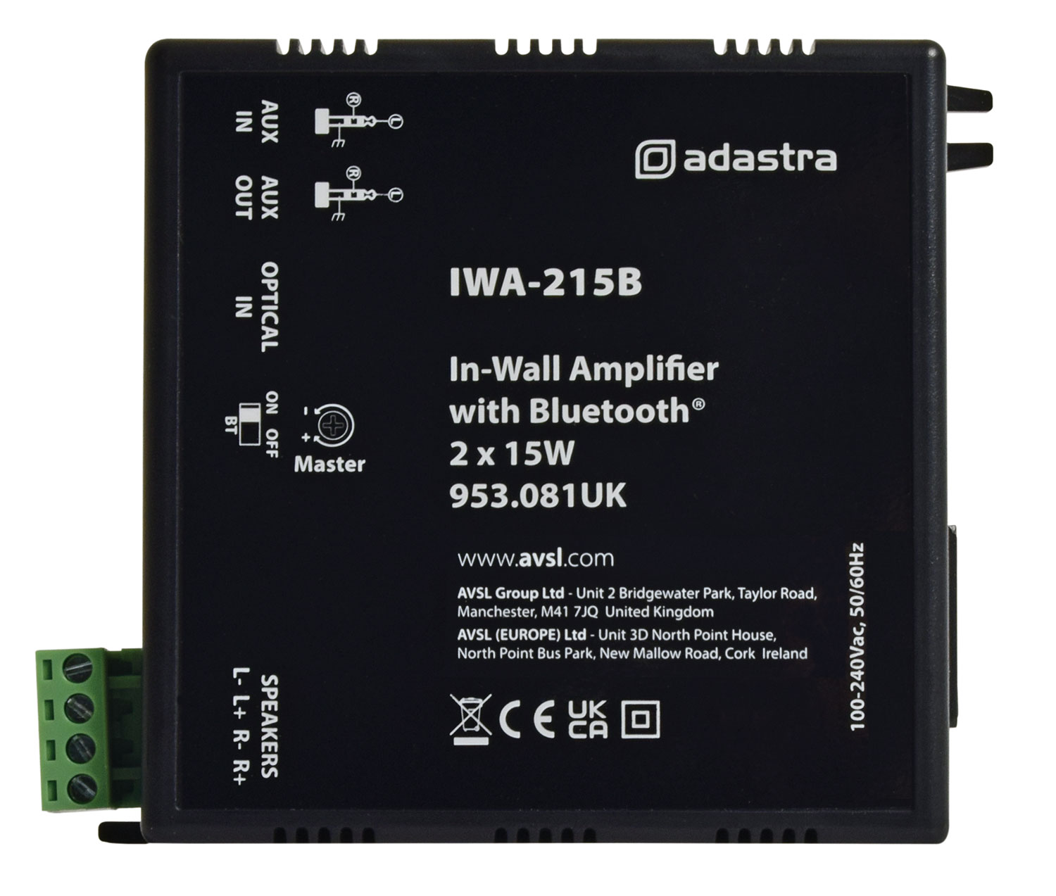 Stereo amplifier units for background music and public address in a minimalist housing for installation into cavity walls and ceilings. Class-D amplifier design operates cleanly and efficiently with minimal heat dissipation, combined with an internal digital switch-mode power section, which enables easy connection directly from the local mains supply. Bluetooth compatibility enables wireless streaming of audio files from a smart phone or other enabled device in addition to 3.5mm Aux input and an optical digital audio input, ideal for integrating into A-V systems. For discreet and trouble-free installation without any need for table-top or cabinet installation, these amplifiers can be combined with many different speaker types to provide the ideal sound system for any small to medium space or deployed in numbers to create a wide area sound installation.