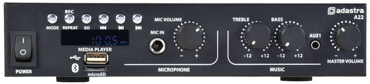 Digital stereo PA amplifier with integral media player in a compact housing. Class-D amplifier section can deliver up to 2 x 55W max. output for background music with a microphone input for announcements or alerts. The media player section can select between USB / microSD mp3 player, FM tuner, Bluetooth receiver, 2 stereo line inputs (rear panel RCA) and another line input on the front panel (3.5mm). Playback can be controlled from the front panel or by the supplied I.R. remote control. Four mounting brackets are provided which enable the A22 to be fitted under a counter top or against a wall for discreet installation. Two A22 units may be mounted side-by-side into a 1U rack space, which can serve smaller peripheral zones in a larger PA installation. Combine with 2 or 4 speaker units for a truly space-saving sound system with comprehensive and easy-to-use functions.