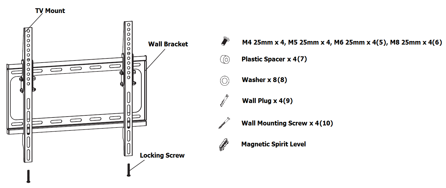 Step 2 – Fixing TV bracket to the screen, please use plastic spacer if the back of the screen is uneven.