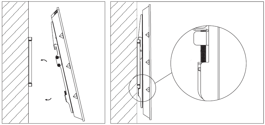 Step 3 – Hook the TV bracket on to the wall mount and gently rest the TV against the wall as shown below. Use a screw driver to fix the locking screw in until the TV is completely fixed to the bracket.