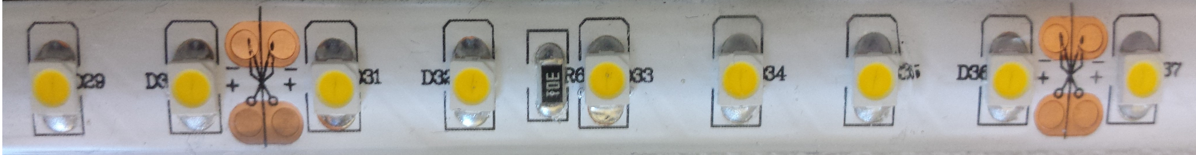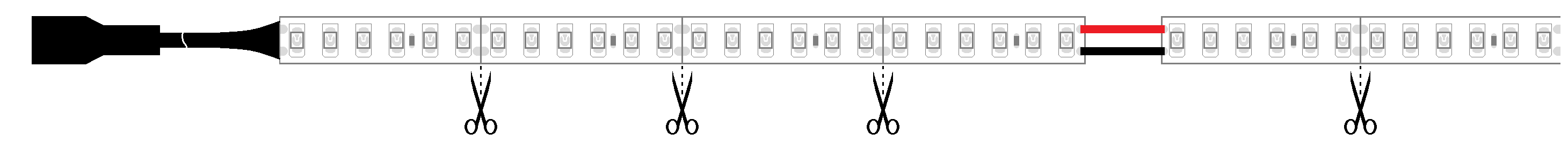 Where less than 5m of tape is needed, there are solder points as shown below, where the tape may be cut to size. These cut points will be at 5cm intervals. In order to re-connect to another length of tape after cutting, strip away the epoxy coating at the solder points and solder a wire from “+” to “+” and a wire from “-” to “-” as shown below.