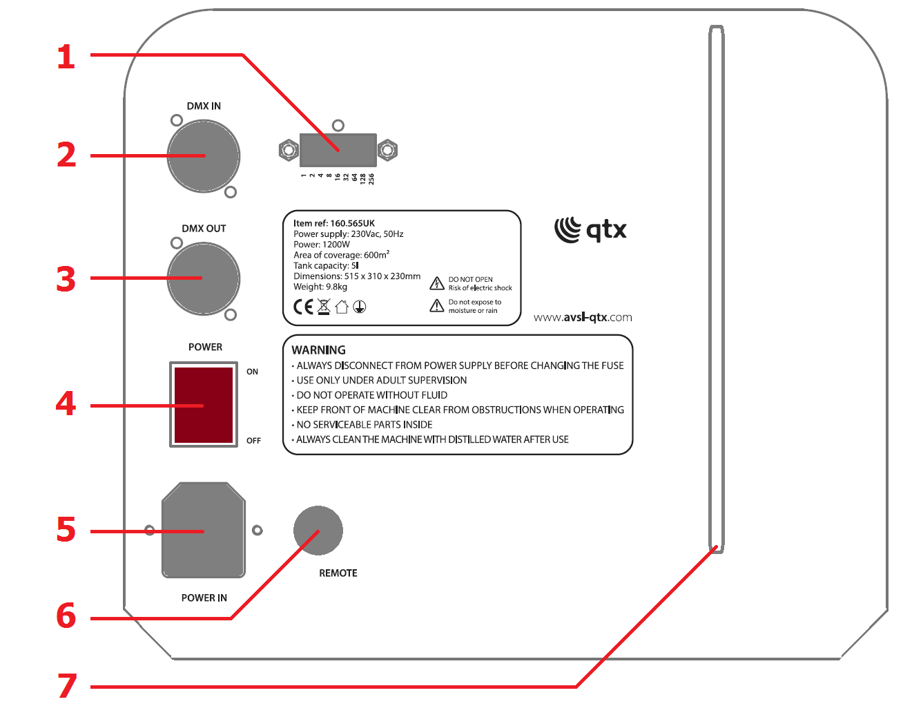| 5. | Mains inlet (IEC male) and fuse holder |