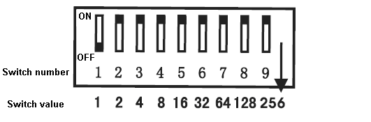 Set the DMX address (single channel) using the DIP switches (1) in binary format as shown below.