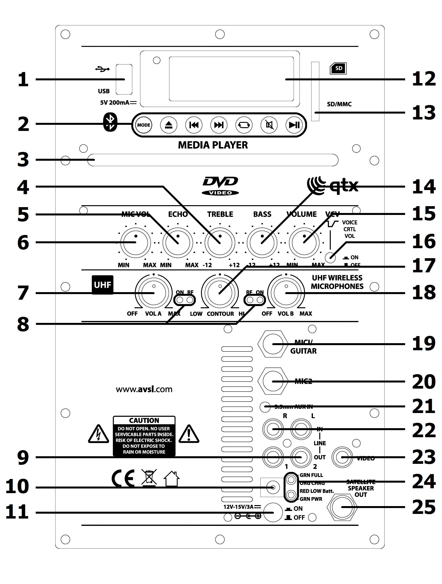 In addition to the PAV-series PA’s own UHF microphones, two 6.3mm jack inputs (19, 20) are provided for connecting external wired or wireless microphones, which are both governed by the MIC VOL control (6). For guitarists, MIC 1 input can accept a guitar input instead of a mic.