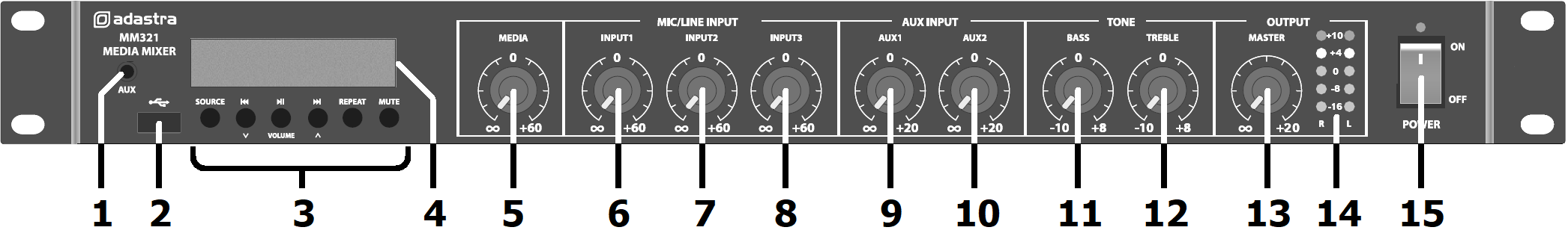 Thank you for choosing an Adastra MM321 mic/line mixer with built-in media player as part of your sound reinforcement system. This unit is designed to offer high quality, dependable service for audio mixing and distribution.