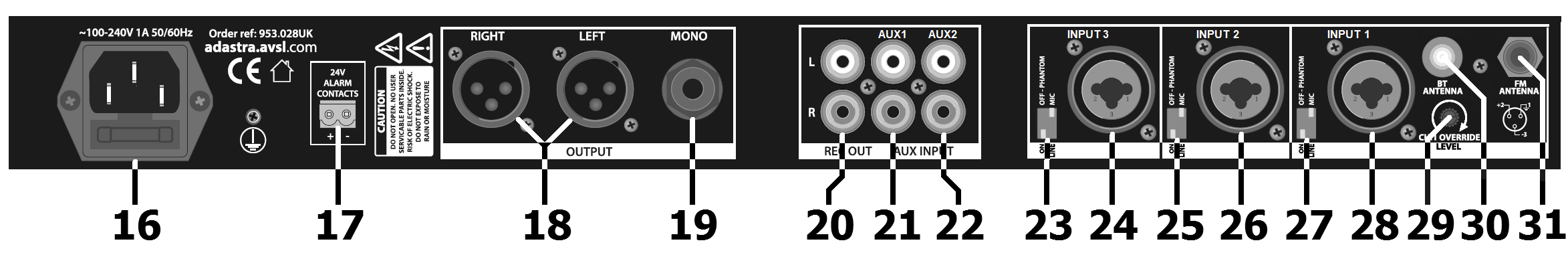 If available, connect a 24V trigger from an alarm panel to the alarm contacts (17) to mute all except channel 1 in an emergency.