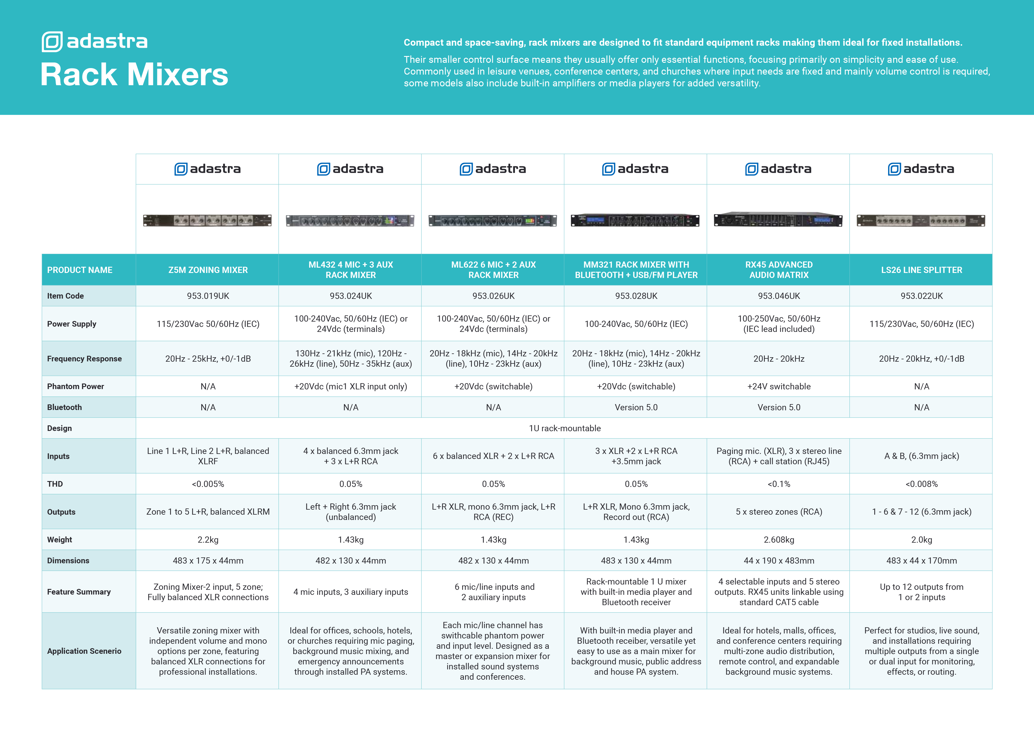 Whether you’re a DJ looking for smooth crossfader control and USB playback, a live sound engineer requiring multiple mic inputs and advanced DSP processing, a venue installing a rack-mounted zoning system, or a performer seeking a compact, portable mixer with Bluetooth and audio interface functionality, our comparison charts are designed to guide you towards the most suitable solution.
