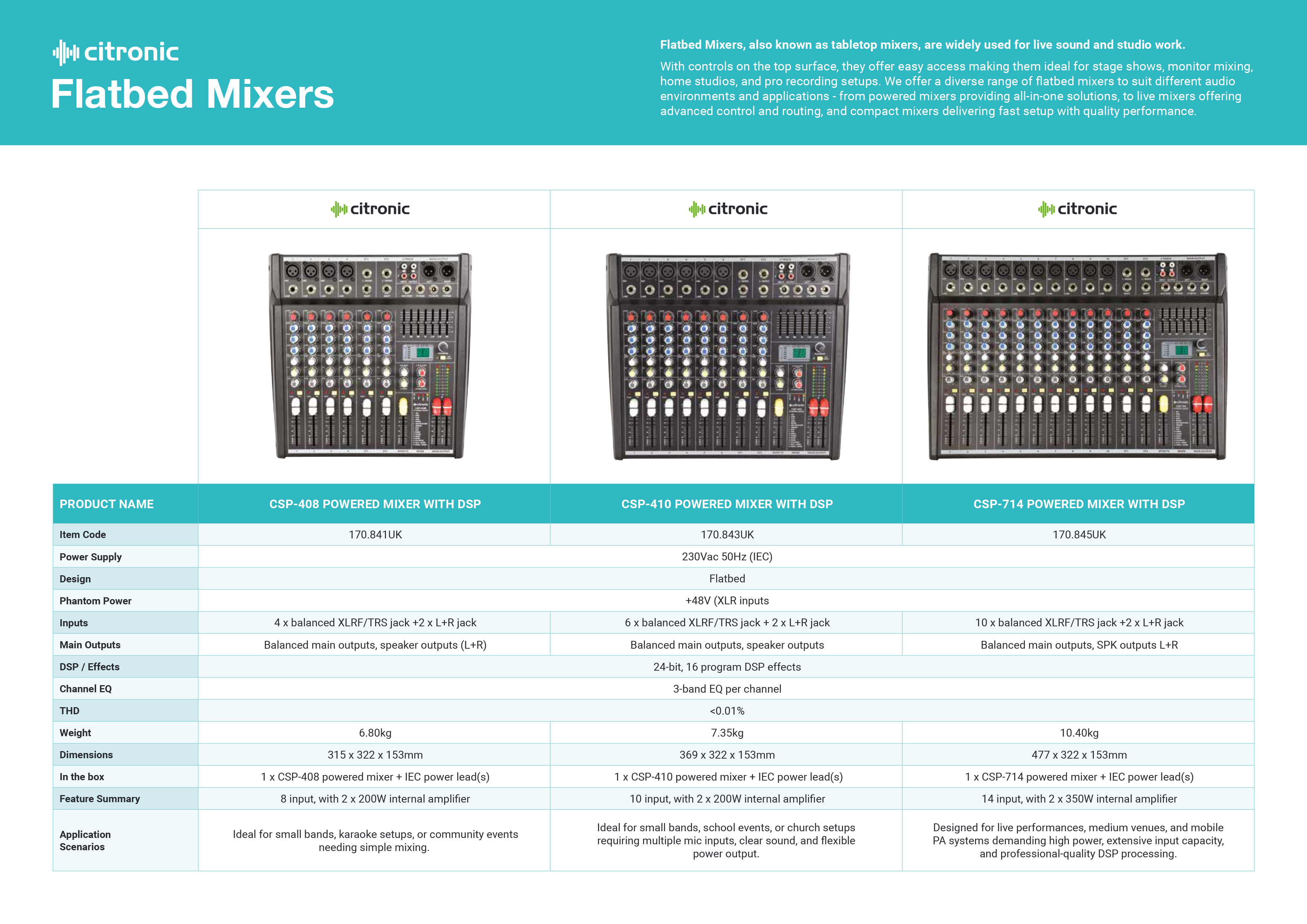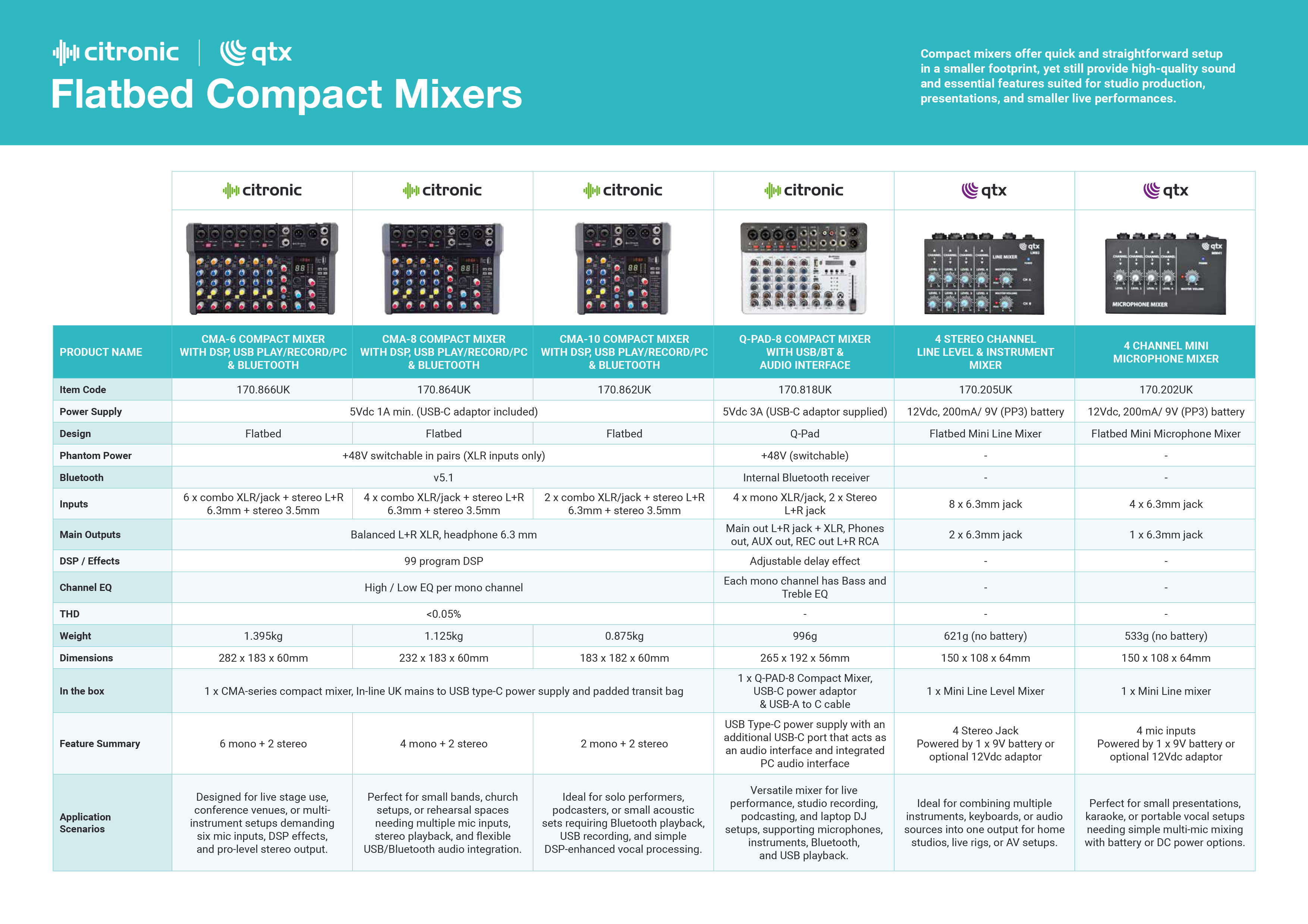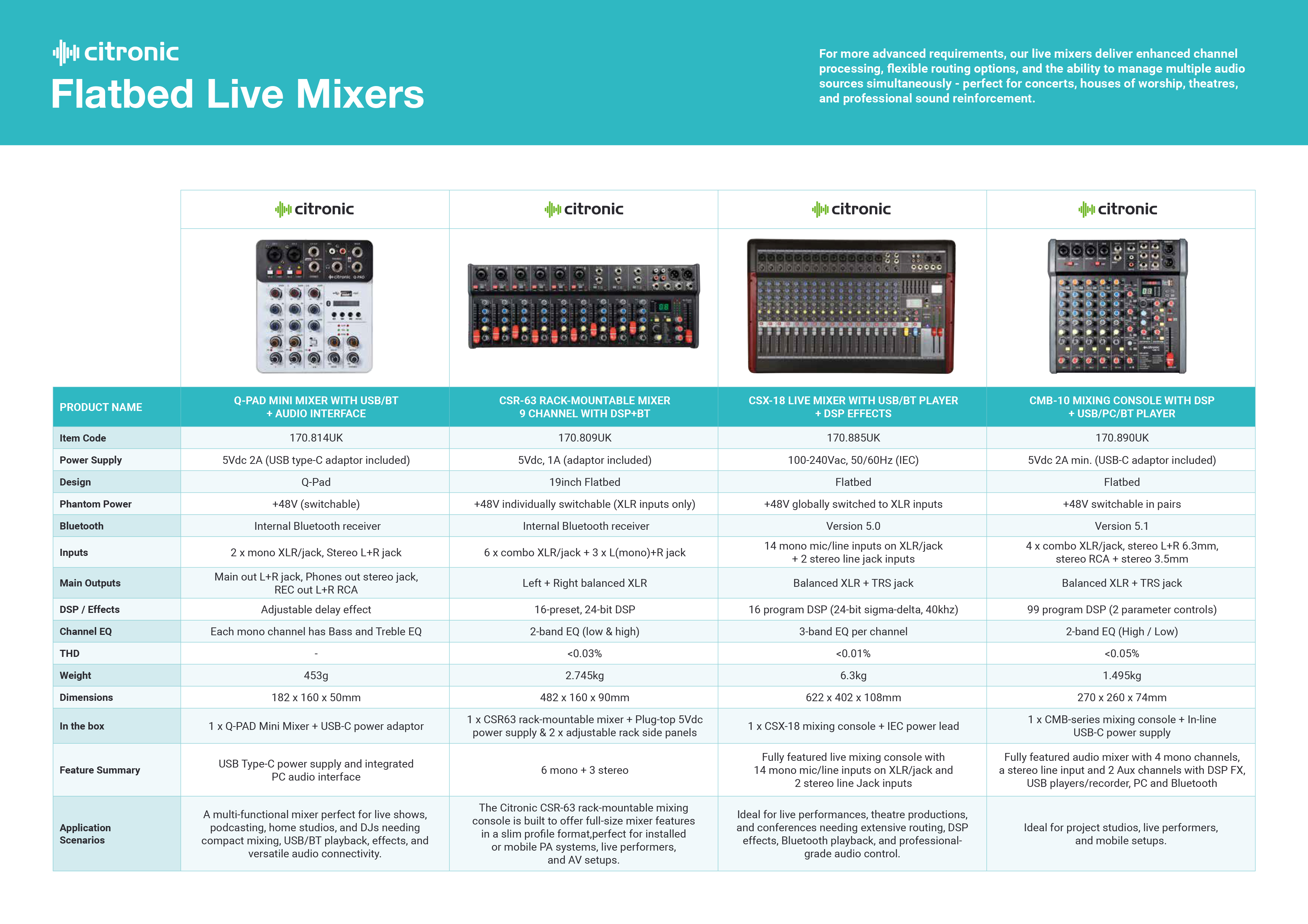 These charts have been carefully structured to present the most important specifications side by side, from channel count, input configurations, and EQ options, to DSP effects, Bluetooth connectivity, USB/PC interfaces, phantom power, output formats, and even physical dimensions and weight. By organising the information in a consistent format across each mixer category, you can quickly identify which models meet your technical requirements and suit your intended environment.