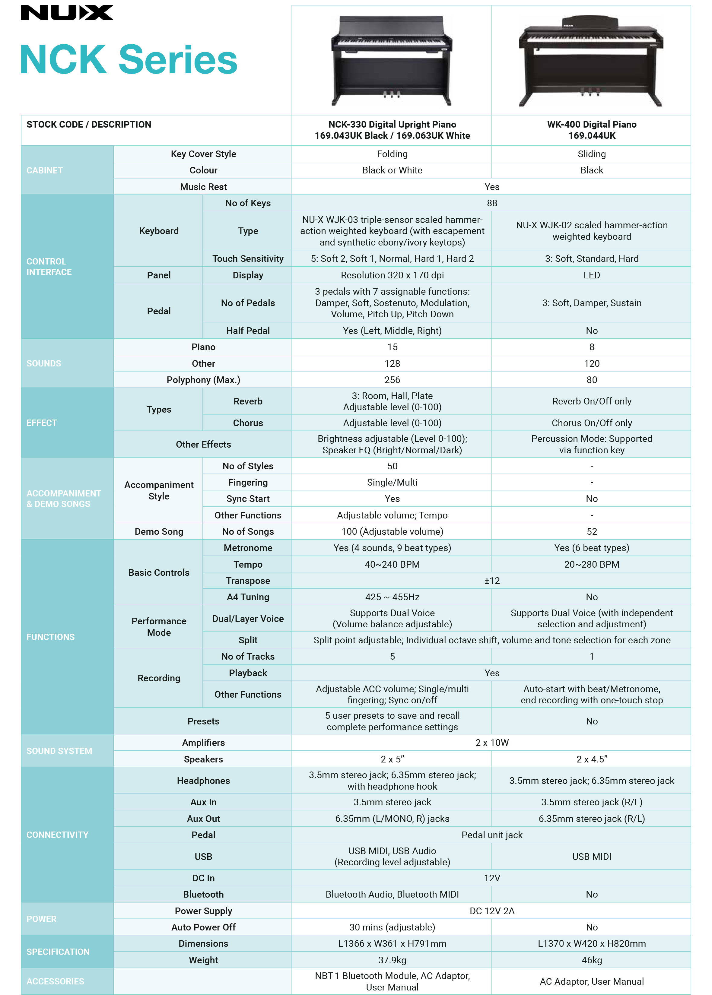 Choosing the ideal NU-X NCK Digital Piano just got easier with our NCK Series Comparison Chart – a quick reference tool designed to simplify side-by-side comparison of sound engines, touch responses, and features.